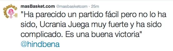 "Cela semblait une partie facile, mais cela ne l'était pas. L'Ukraine a très bien joué et ce fut compliqué. C'est une belle victoire. Il a fallu jouer en équipe, pour chercher les tirs ouverts. On regarde match par match et on se concentre à présent seulement sur le Portugal" Hind Ben Abdelkader à Oscar Cuesta (masbasket.com).