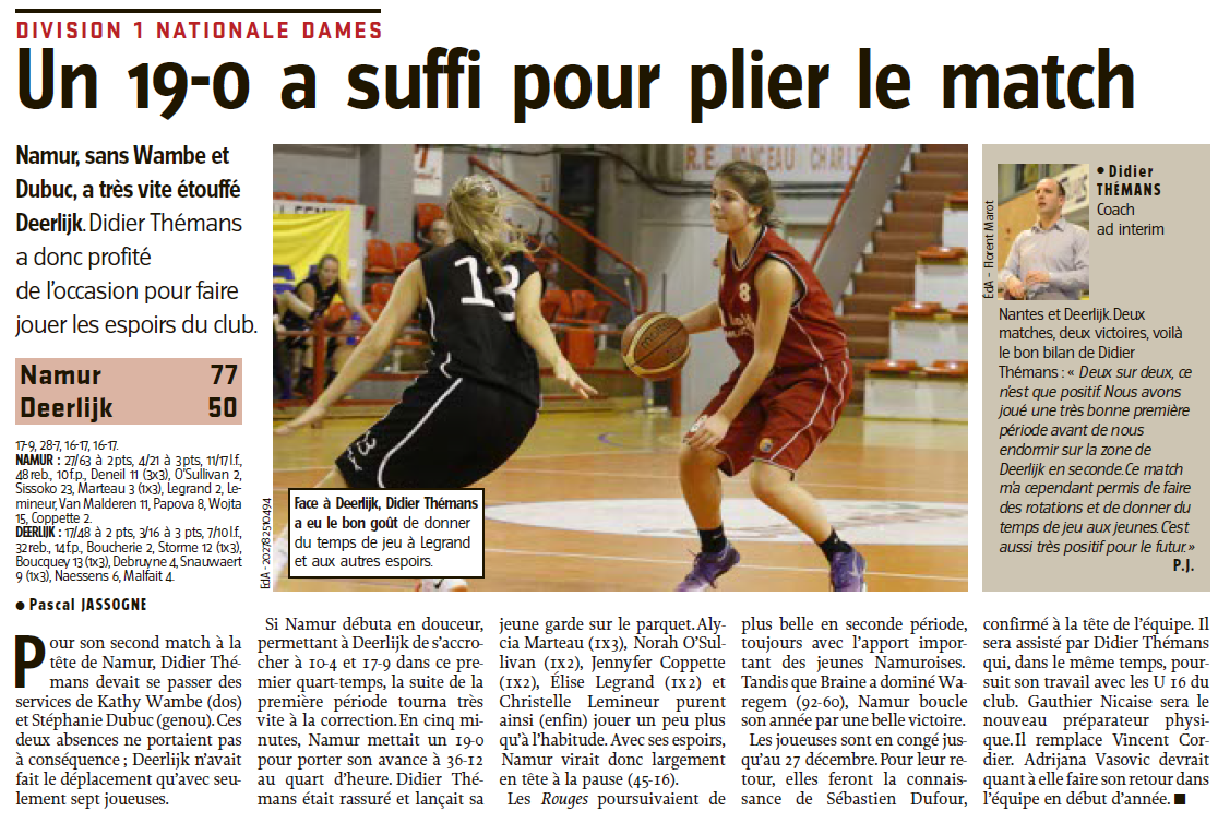 | 14/12/2013 | 20:30 | Za/Sam | Belfius Namur Capitale | Tulikivi Deerlijk Dames | 77-50
