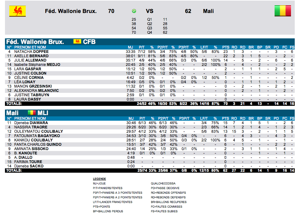 Les Liégeoises ont entamé la partie sur les chapeaux de roue avec 14 des 25 points du premier quart temps (25-11) pour Natacha Doppée. Avec un passage à la pause à 38-28, et 16 unités pour Axelle Bernard, les Maliennes sont revenues dans le match avec leurs intérieures de taille dominant le rebond. Le Mali repassait devant à la demi-heure (54-55). C'est dans le quatrième quart sous la houlette de Julie Allemand (14 pts en deuxième mi-temps) que les filles de Pierre Cornia prenaient le dessus pour aller chercher leur qualification pour le dernier carré. Seule bémol au tableau, la blessure de Manon Grzesinski qui n'aura joué que 15 minutes dans ce quart de finale.