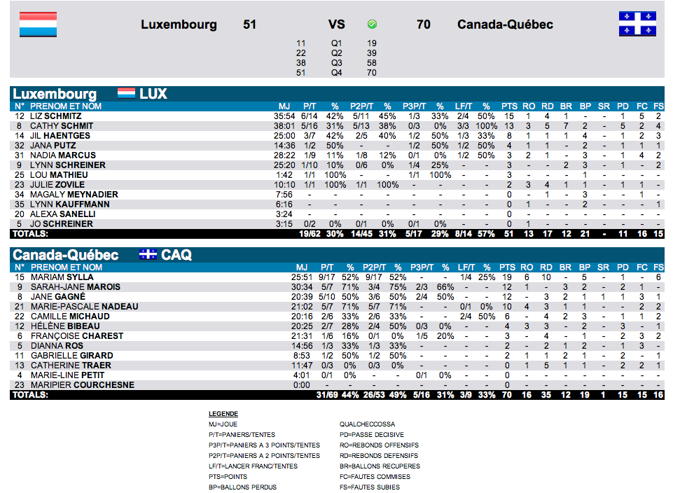 Le Luxembourg par contre a été éliminé en quarts de finale (70-51) par le Québec qui rencontrera en demi-finales la Côte d'Ivoire, victorieuse de la France 68 à 63. Les Luxembourgeoises retrouveront la France sur leur route en match de classement.