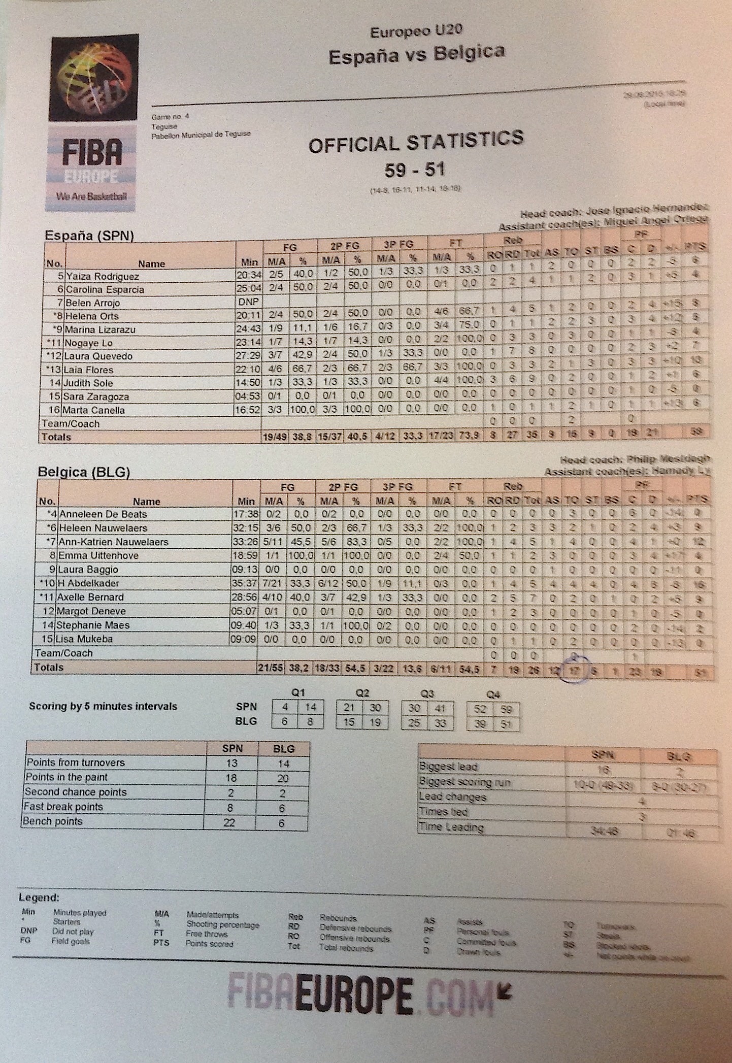 Défensivement bien en place, quelques erreurs individuelles et un +8 en début de dernière ligne droite ont forcé l'écart à 16 unités pour l'Espagne qui s'est finalement imposée 59-51, après un retour des U20. Les Belges ont remporté la seconde période. An-Katrien Nauwelaers a rajouté 12 unités, Heleen Nauwelaers et Axelle Bernard (7 rebonds), 9 chacune.