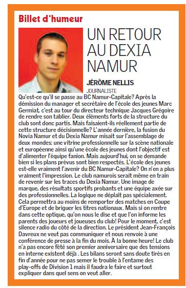 Le malaise qui caractérisait la conférence de presse annonçant la fusion entre Dexia Namur et Novia Munalux Namur il y a juste un an est réapparu au grand jour ces dernières semaines. Après Jacques Ippersiel, membre du Comité, Marc Germiat, c'est une troisième personnalité du club fusionné qui a jeté l'éponge. Tous dénoncent la fracture entre le projet de D1 hérité de feu Dexia Namur et l'école des jeunes, caractéristique du Novia. Le dernier départ en date, c'est celui de Jacques Grégoire, donc, qui a décidé jeudi de rendre son tablier de directeur technique des jeunes. Pour lui, le club vend son âme et, lui non plus ne se retrouve pas dans la façon de fonctionner d'un club fusionné, c'est une certitude, à la vite.