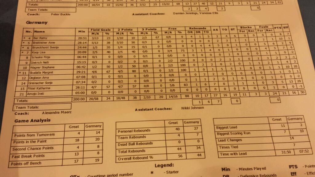 La Grande-Bretagne s’est inclinée 54 à 56 face à l’Allemagne pour son deuxième match de préparation face aux Allemandes dimanche à Worcester. Largement victorieuses la veille 64-42, les Britanniques ont du cette fois faire face à une plus forte résistance de l’Allemagne, emmenée par Romy Bär, Breitreiner ou Fikiel. Du côté des Britanniques, Temi Fengbele s’est encore offert 14 pts et 12 rebonds. Stephaine Gandy a rajouté 12 unités. C’est encore Katharina Fikiel qui a donné la victoire à l’Allemagne à 2.4.